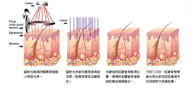 飛梭/UP雷射:運用氣化式能量破壞真皮層使皮膚新生,多為痘疤治療。