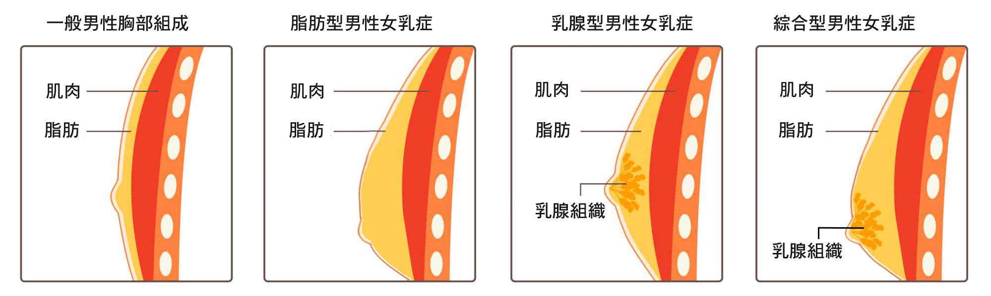 • 乳腺型男性女乳:以乳腺組織增生為主,需透過乳腺切除手術。