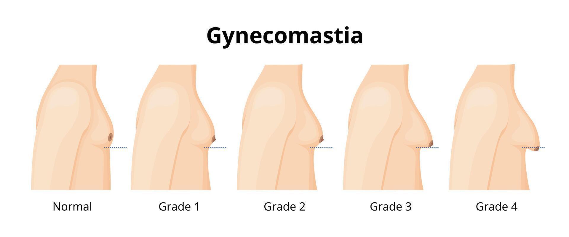 • 第四級(重度):乳房組織嚴重腫脹,並有明顯的皮膚鬆弛,乳頭下垂至胸部下緣以下,外觀非常類似女性乳房。