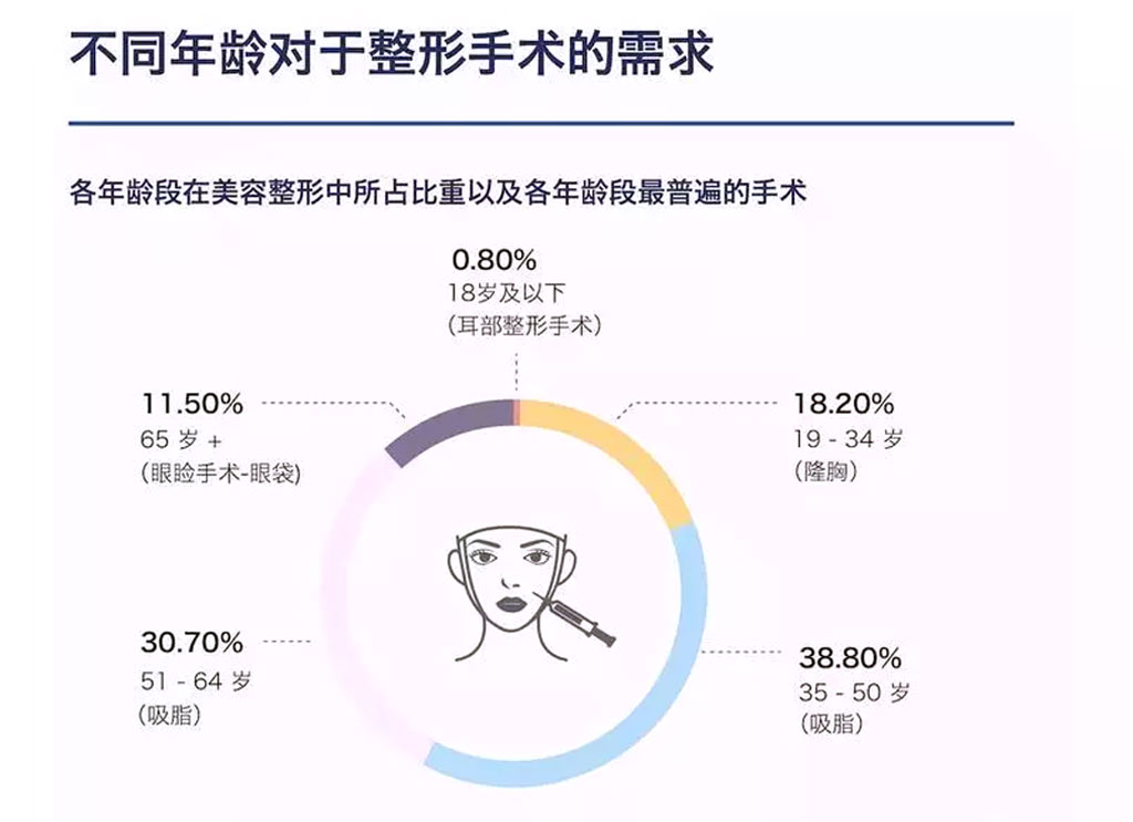 微整形以風險相對較低、恢復期短等優勢正在佔據醫美行業總收入的絕大部分。 美國整形協會通過研究得出,收入每提升一倍,消費者對於外科整形手術的需求就會降低 62%,而對於微整形項目,消費者的需求則會提升 463%,看來人們更願意通過選擇「小修小補」來保持顏值的延續或提升。